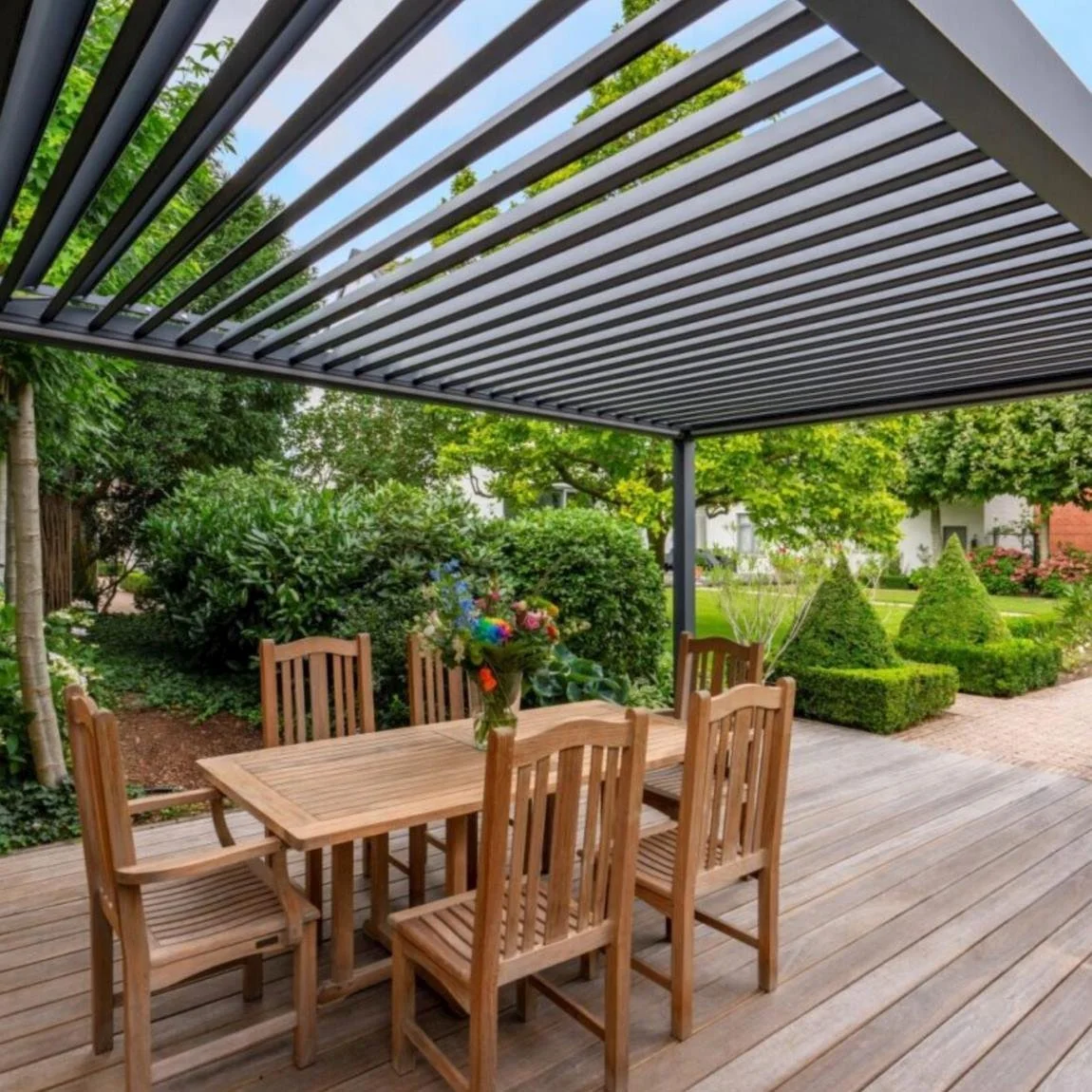 A louvred roof creates a covered outdoor space that adapts to the weather at the touch of a button. With adjustable aluminium louvres that open and close, you can control sunlight, shade and ventilation throughout the day.